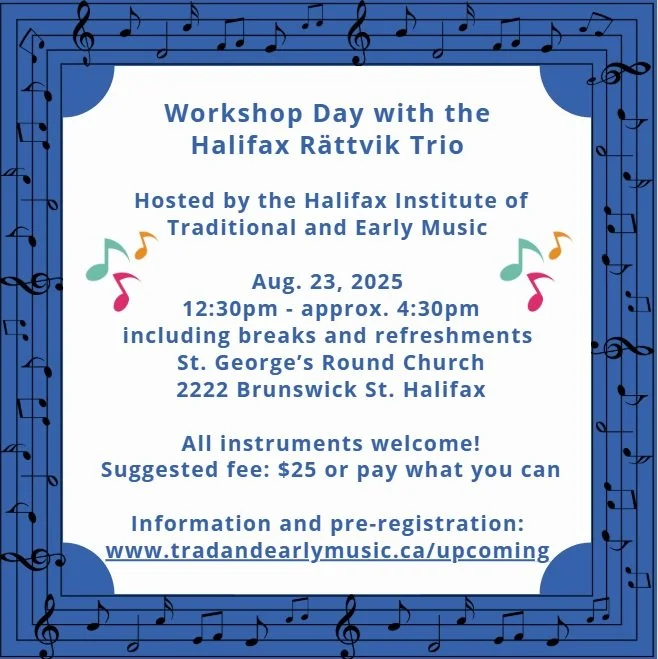 Aug. 23 - Workshop Day, Halifax - Hosted by the Halifax Institute of Traditional and Early Music at St. George’s Round Church, Halifax, 12:30pm-4:30pm